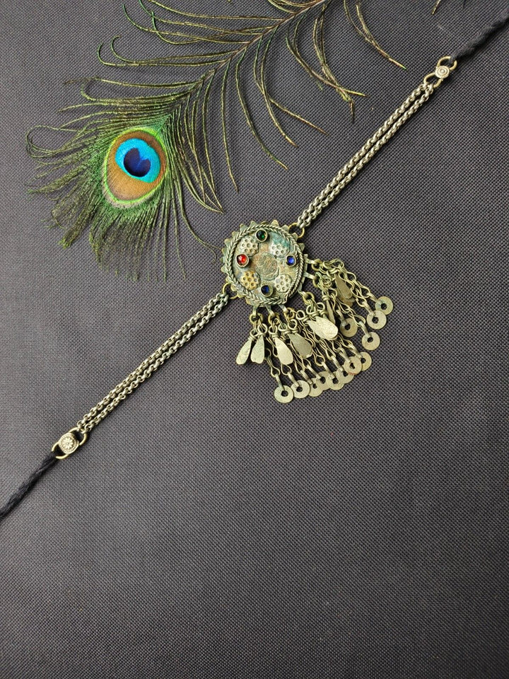 Afghani heritage jewellery is a vibrant expression of Afghanistan's rich cultural tapestry, characterized by handcrafted metalwork, semi-precious stones, coin embellishments, and colourful glass inlays. Drawing influences from Pashtun, Hazara, Turkman, and Kuchi tribal styles, these pieces are typically made from silver or mixed metals and often feature filigree patterns, chains, bells, and tassels. The jewellery is known for its ornate and statement-making aesthetic. Worn historically during weddings, festivals, and dances, Afghani jewellery is not only decorative but also a symbol of identity, status, and craftsmanship passed through generations.
