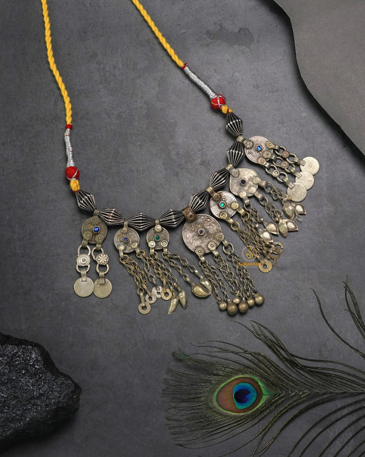 Afghani heritage jewellery is a vibrant expression of Afghanistan's rich cultural tapestry, characterized by handcrafted metalwork, semi-precious stones, coin embellishments, and colourful glass inlays. Drawing influences from Pashtun, Hazara, Turkman, and Kuchi tribal styles, these pieces are typically made from silver or mixed metals and often feature filigree patterns, chains, bells, and tassels. The jewellery is known for its ornate and statement-making aesthetic. Worn historically during weddings, festivals, and dances, Afghani jewellery is not only decorative but also a symbol of identity, status, and craftsmanship passed through generations.