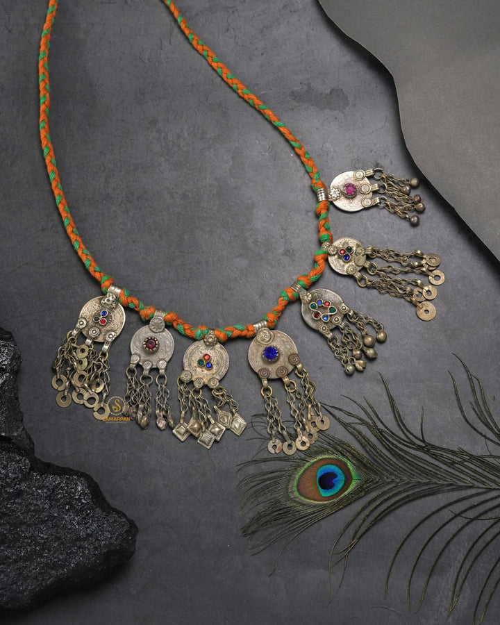 Afghani heritage jewellery is a vibrant expression of Afghanistan's rich cultural tapestry, characterized by handcrafted metalwork, semi-precious stones, coin embellishments, and colourful glass inlays. Drawing influences from Pashtun, Hazara, Turkman, and Kuchi tribal styles, these pieces are typically made from silver or mixed metals and often feature filigree patterns, chains, bells, and tassels. The jewellery is known for its ornate and statement-making aesthetic. Worn historically during weddings, festivals, and dances, Afghani jewellery is not only decorative but also a symbol of identity, status, and craftsmanship passed through generations.