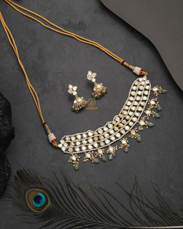 ✨ Polki–Moissanite Jewellery is a regal blend of timeless tradition and modern brilliance. Handcrafted with uncut natural polki stones and dazzling moissanite gems, this jewellery exudes royal charm with a sparkling touch. Perfect for weddings, festive occasions, and statement looks, it carries the richness of heritage while offering unmatched radiance and elegance. Store in a cool, dry place away from direct sunlight, Avoid exposure to harsh chemicals or cleaning products, Clean with soft cloth and mild soap solution.Own a piece of timeless elegance with our Polki-Moissanite Jewelry collection. Order now!"