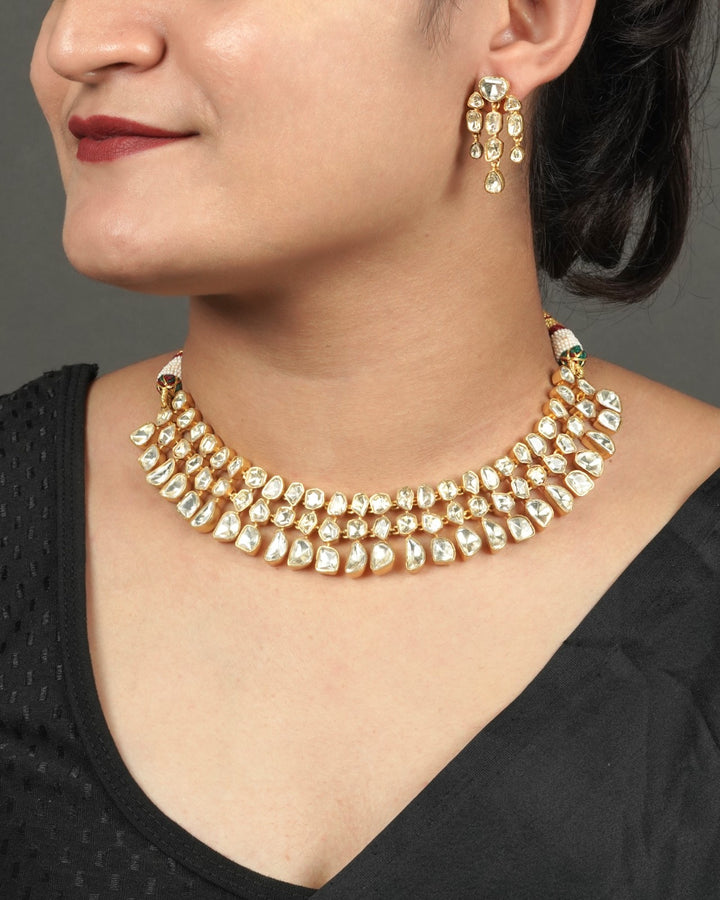 ✨ Polki–Moissanite Jewellery is a regal blend of timeless tradition and modern brilliance. Handcrafted with uncut natural polki stones and dazzling moissanite gems, this jewellery exudes royal charm with a sparkling touch. Perfect for weddings, festive occasions, and statement looks, it carries the richness of heritage while offering unmatched radiance and elegance. Store in a cool, dry place away from direct sunlight, Avoid exposure to harsh chemicals or cleaning products, Clean with soft cloth and mild soap solution.Own a piece of timeless elegance with our Polki-Moissanite Jewelry collection. Order now!"