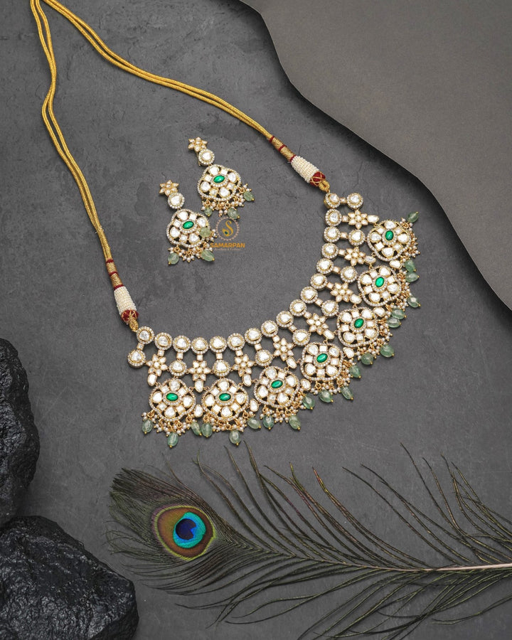✨ Polki–Moissanite Jewellery is a regal blend of timeless tradition and modern brilliance. Handcrafted with uncut natural polki stones and dazzling moissanite gems, this jewellery exudes royal charm with a sparkling touch. Perfect for weddings, festive occasions, and statement looks, it carries the richness of heritage while offering unmatched radiance and elegance. Store in a cool, dry place away from direct sunlight, Avoid exposure to harsh chemicals or cleaning products, Clean with soft cloth and mild soap solution.Own a piece of timeless elegance with our Polki-Moissanite Jewelry collection. Order now!"