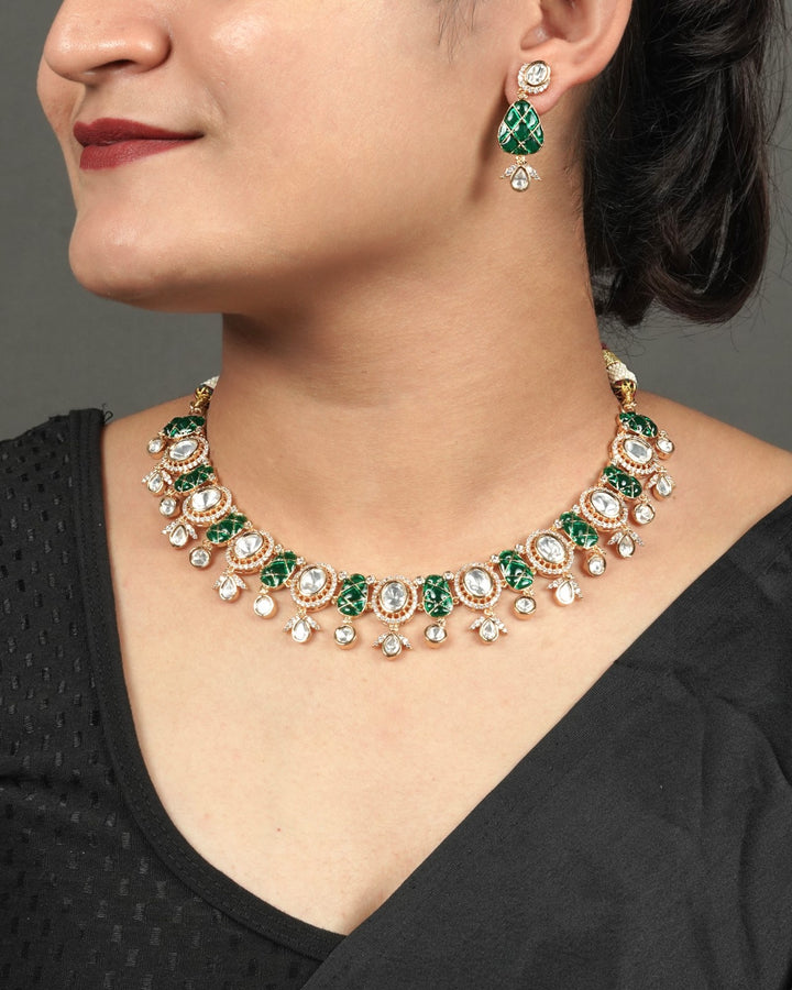 ✨ Polki–Moissanite Jewellery is a regal blend of timeless tradition and modern brilliance. Handcrafted with uncut natural polki stones and dazzling moissanite gems, this jewellery exudes royal charm with a sparkling touch. Perfect for weddings, festive occasions, and statement looks, it carries the richness of heritage while offering unmatched radiance and elegance. Store in a cool, dry place away from direct sunlight, Avoid exposure to harsh chemicals or cleaning products, Clean with soft cloth and mild soap solution.Own a piece of timeless elegance with our Polki-Moissanite Jewelry collection. Order now!"