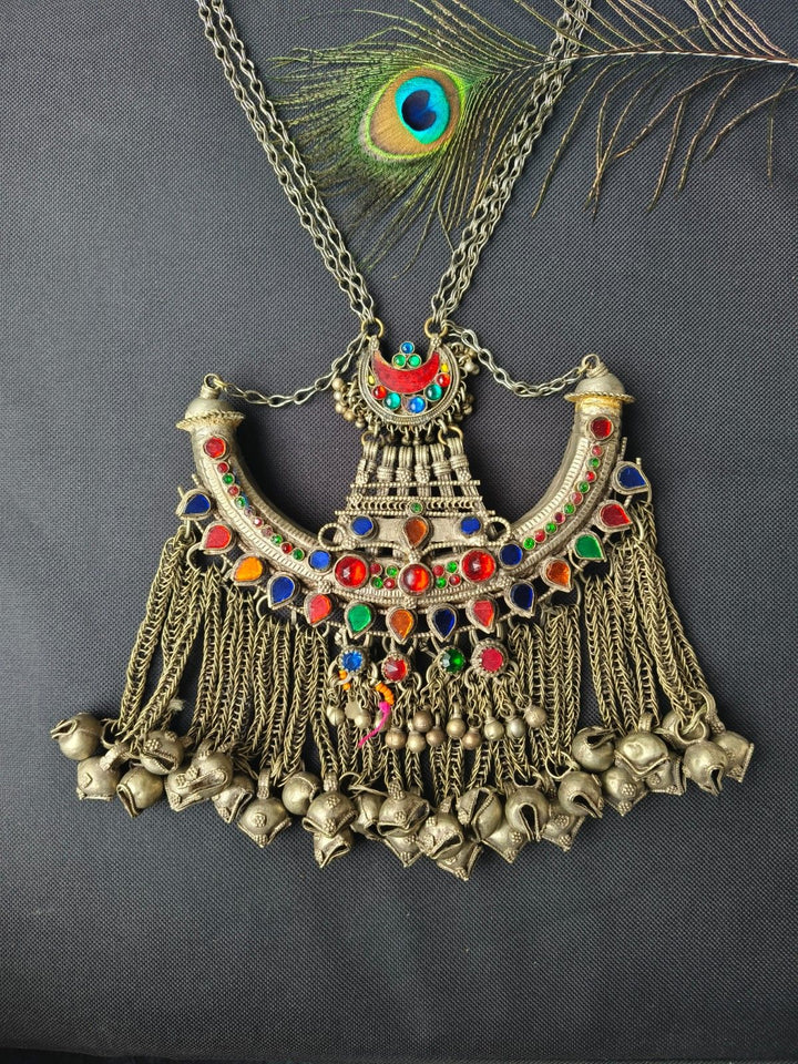 Afghani heritage jewellery is a vibrant expression of Afghanistan's rich cultural tapestry, characterized by handcrafted metalwork, semi-precious stones, coin embellishments, and colourful glass inlays. Drawing influences from Pashtun, Hazara, Turkman, and Kuchi tribal styles, these pieces are typically made from silver or mixed metals and often feature filigree patterns, chains, bells, and tassels. The jewellery is known for its ornate and statement-making aesthetic. Worn historically during weddings, festivals, and dances, Afghani jewellery is not only decorative but also a symbol of identity, status, and craftsmanship passed through generations.